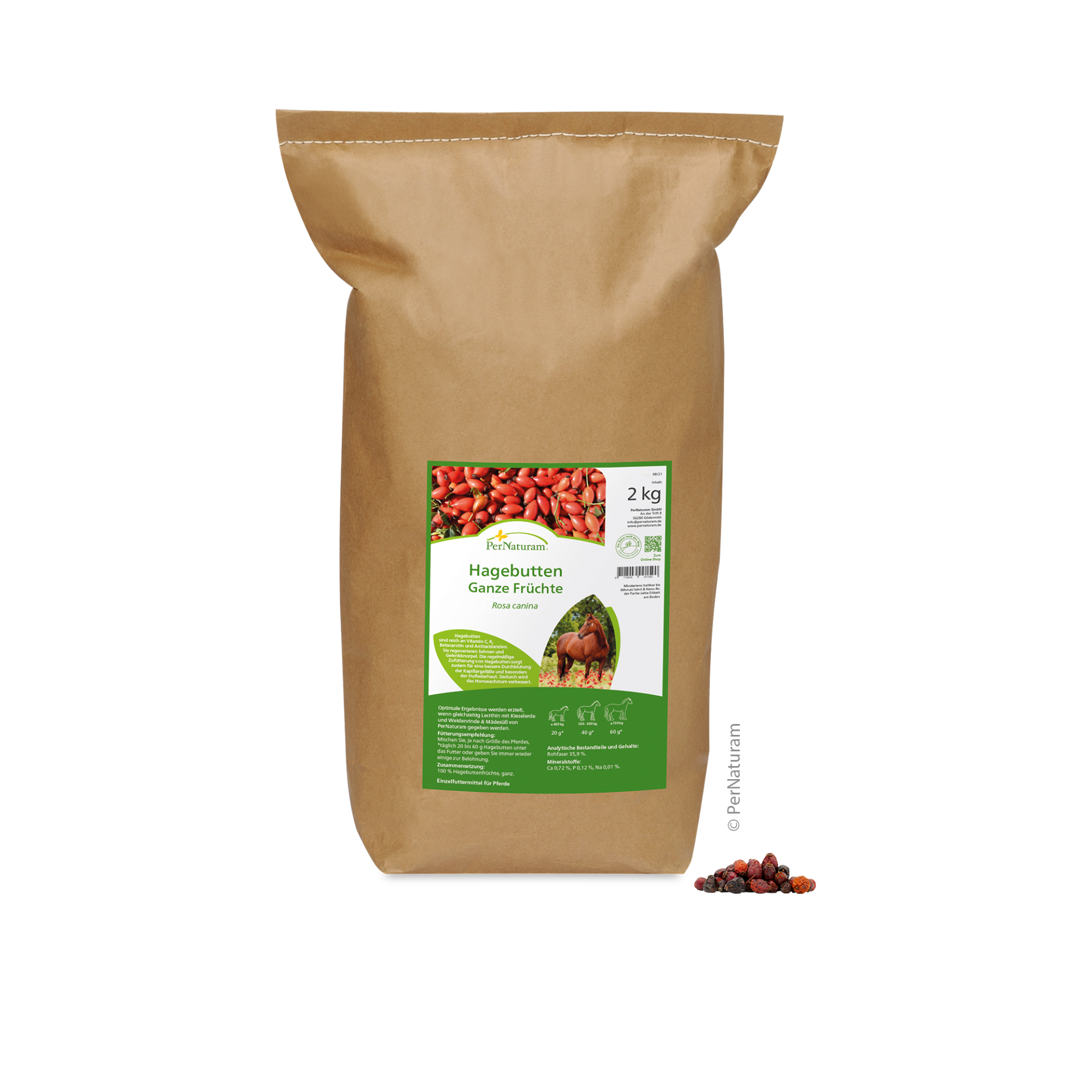 Meng, afhankelijk van de grootte van het paard, dagelijks een volle eetlepel tot een handvol rozenbottels door het voer, of geef er een paar als beloning.
